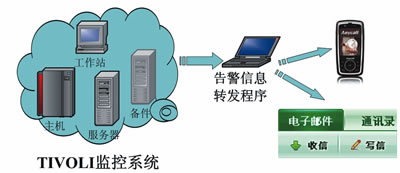 在具體實施上,為了形成統(tǒng)一的體系以方便監(jiān)控并達(dá)到告警信息與實時的反饋,可將以上4個層面因素納入IBM公司開發(fā)的TIVOLI監(jiān)控系統(tǒng)。除此之外,為實現(xiàn)告警信息的自動推送與分發(fā),可將自行開發(fā)告警信息轉(zhuǎn)發(fā)程序接入TIVOLI監(jiān)控系統(tǒng)信息庫。一旦檢測到異常信息存在則立即進(jìn)行短信或郵件的發(fā)送,確保維護(hù)人員及時了解接口系統(tǒng)運(yùn)行情況。整個過程如圖2所示。
