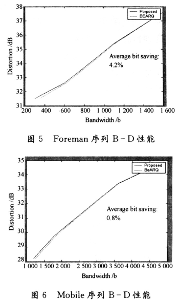 將圖4~圖6對(duì)比可以看出,對(duì)于運(yùn)動(dòng)程度很低且紋理相對(duì)平緩的Akiyo序列來(lái)說,相對(duì)盡力而為ARQ機(jī)制,本文的機(jī)制在3%的丟包情形下可以節(jié)省20%以上的帶寬。而對(duì)運(yùn)動(dòng)較為劇烈的Foreman序列來(lái)說,則只能節(jié)省4%的帶寬。對(duì)紋理很復(fù)雜的Mobile序列,本文的算法相對(duì)于BEARQ,帶寬僅節(jié)省不到1%。從表1的重發(fā)率和圖4~圖6的對(duì)應(yīng)關(guān)系不難看出,重發(fā)率越高,則對(duì)應(yīng)B-D性能的改善程度就越低。因此可以說實(shí)驗(yàn)仿真表明了本文提出的傳輸控制算法,能夠在保證視頻接收質(zhì)量的同時(shí),有效降低傳輸所用帶寬。