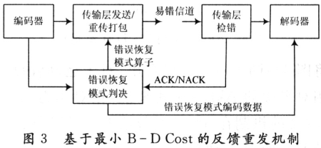 式中:rg是指出錯(cuò)的部分被正確重傳到接收端的比特?cái)?shù)。當(dāng)r0≥(1-p)r+pr/(1-p)時(shí),所有出錯(cuò)的比特都實(shí)現(xiàn)了重傳,所以終端接收失真等于編碼端失真。否則,則按照式(7)中的兩個(gè)關(guān)系式,即可得到d0關(guān)于r0的表達(dá)式(5)。確立了上述關(guān)系后,結(jié)合相關(guān)的容錯(cuò)平臺(tái),設(shè)計(jì)出基于B-DCost的反饋重發(fā)機(jī)制,其原理框圖如圖3所示。