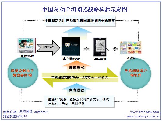 易觀國際(Analysys International)分析認(rèn)為,中國移動發(fā)展手機(jī)閱讀的整體思路是基于渠道資源,縱貫內(nèi)容、終端以強(qiáng)勢整合手機(jī)閱讀的產(chǎn)業(yè)鏈。將原有的手機(jī)閱讀的短信/彩信形式演變?yōu)榭蛻舳塑浖?WAP、手持終端、WWW的形式,最終為用戶提供手機(jī)閱讀的無縫鏈接體驗。