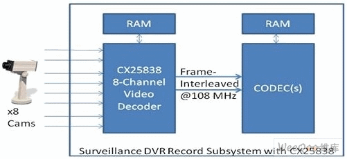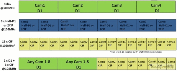 CX25838為監(jiān)控DVR設(shè)計(jì)人員提供機(jī)會(huì),通過(guò)提供幀交錯(cuò)數(shù)據(jù)實(shí)現(xiàn)編解碼器效率最大化,而不采用昂貴的FPGA或可編程邏輯。它還通過(guò)提供各種分辨率和幀速率,在一系列產(chǎn)品*享系統(tǒng)架構(gòu),提供規(guī)模優(yōu)勢(shì)的能力。例如,低成本DVR可采用一個(gè)編解碼器以全幀速率壓縮16個(gè)CIF分辨率通道,這可通過(guò)一條8位總線實(shí)現(xiàn)。其他解決方案可能需要每個(gè)編解碼器以全幀速率壓縮4個(gè)D1分辨率通道。還有些可能需要降低幀速率的D1