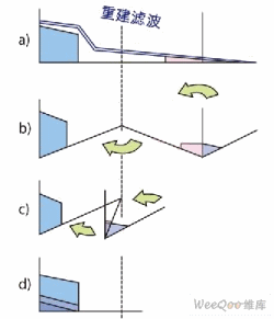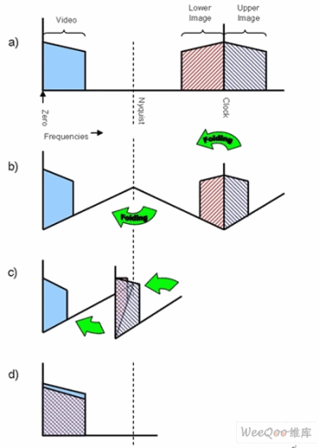 從圖5可以看出重建濾波器的作用,利用參考書中提供的定理可以很容易理解頻譜混疊。通常,在頻域,頻率和放大倍數(shù)都采用對(duì)數(shù)刻度,重建濾波器的頻響特性表現(xiàn)為平滑曲線。然而,為了說(shuō)明邊帶重疊的位置,我們用線性坐標(biāo)表示頻率和放大倍數(shù)。為了表示低通濾波器在同樣刻度坐標(biāo)下的衰減特性,從濾波器頻響曲線可以看出:對(duì)于有用的視頻信號(hào)衰減很少,對(duì)于鏡像頻率衰減較大。圖5b和5c顯示了混疊效應(yīng),但是應(yīng)該注意到,與圖3d相比,圖5d中的鏡像頻率被顯著衰減。