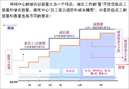 業(yè)務(wù)模塊化后,客服中心對(duì)一線客服代表進(jìn)行分級(jí)認(rèn)證,針對(duì)簡(jiǎn)單業(yè)務(wù)和復(fù)雜業(yè)務(wù)分別設(shè)置首層和二線專(zhuān)席兩類(lèi)共計(jì)8種人員承接梯隊(duì),達(dá)到業(yè)務(wù)與人員的全匹配。人員梯隊(duì)的設(shè)置對(duì)人員的培訓(xùn)管理和進(jìn)出機(jī)制提出了新的挑戰(zhàn),如何科學(xué)界定不同隊(duì)列人員的技能標(biāo)準(zhǔn)?如何設(shè)置不同成長(zhǎng)時(shí)期員工的進(jìn)出管理機(jī)制?