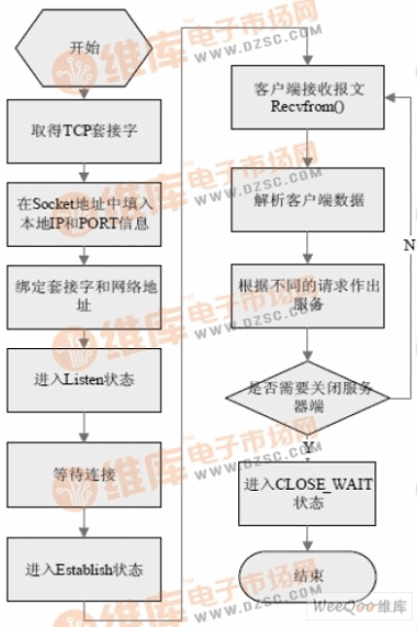 處理抽象。本應(yīng)用中需要派生一個(gè)QTcp 類,實(shí)現(xiàn)傳輸層的TCP 協(xié)議。一般基于 TCP 的網(wǎng)絡(luò)應(yīng)用程序都要繼承QTcp 類,然后在ESTABLISHED 狀態(tài)中添加 子狀態(tài)完成特定的功能。在服務(wù)器端,利用量子框架實(shí)現(xiàn)一個(gè)QServer 類,是一個(gè)活動(dòng)對(duì)象,繼承自QTcp 類。QServer 活動(dòng)對(duì)象同客戶端TCP Socket 連接后,進(jìn)入ESTABLISHED狀態(tài)中,通過(guò)調(diào)用Recvfrom 函數(shù)接收客戶端的請(qǐng)求,然后解析請(qǐng)求的服務(wù)類型,根據(jù)不同請(qǐng)求做出不同的服務(wù)。其軟件流程圖如圖1 所示: