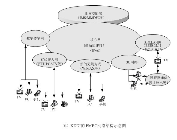 為了在市場(chǎng)競(jìng)爭(zhēng)中立于不敗之地,KDDI另辟稀徑,提出了將固定網(wǎng)、移動(dòng)網(wǎng)、因特網(wǎng)和電視廣播相融合的概念,它與朝日新聞、朝日電視簽署合作框架,就是它的集中代表。FMBC是超3G的構(gòu)想,是以移動(dòng)通信為基礎(chǔ),與固定電話網(wǎng)及因特網(wǎng)進(jìn)行融合,現(xiàn)在又把廣播電視納入,這樣它就成了KDDI的NGN了。FMBC的網(wǎng)絡(luò)結(jié)構(gòu)請(qǐng)見(jiàn)圖4。從圖4上不難發(fā)現(xiàn)NGN的影子,特別是業(yè)務(wù)控制部的設(shè)立,并采用ISM/MMD標(biāo)準(zhǔn),將網(wǎng)絡(luò)與應(yīng)用分開(kāi),以利新業(yè)務(wù)的開(kāi)拓,同時(shí)完成核心網(wǎng)的IP化,這些都是NGN的基本概念。