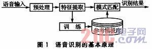 語(yǔ)音識(shí)別的基本原理如圖1所示。語(yǔ)音識(shí)別包括兩個(gè)階段:訓(xùn)練和識(shí)別。不管是訓(xùn)練還是識(shí)別,都必須對(duì)輸入語(yǔ)音預(yù)處理和特征提取。訓(xùn)練階段所做的具體工作是通過(guò)用戶(hù)輸入若干次訓(xùn)練語(yǔ)音,經(jīng)過(guò)預(yù)處理和特征提取后得到特征矢量參數(shù),最后通過(guò)特征建模達(dá)到建立訓(xùn)練語(yǔ)音的參考模型庫(kù)的目的。而識(shí)別階段所做的主要工作是將輸入語(yǔ)音的特征矢量參數(shù)和參考模型庫(kù)中的參考模型進(jìn)行相似性度量比較,然后把相似性最高的輸入特征矢量作為識(shí)別結(jié)果輸出。這樣,最終就達(dá)到了語(yǔ)音識(shí)別的目的。