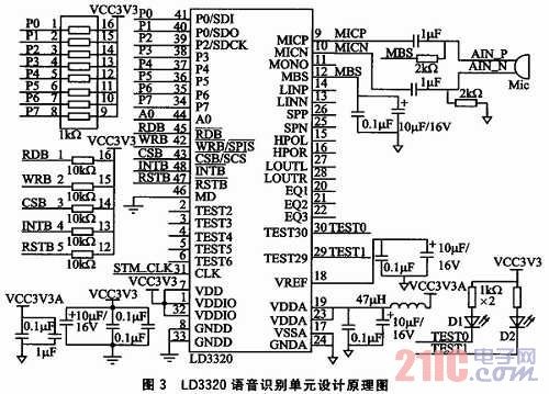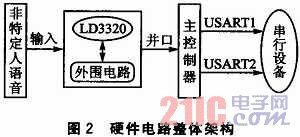 如圖2所示,硬件電路主要包括主控核心部分和語(yǔ)音識(shí)別部分。語(yǔ)音進(jìn)入語(yǔ)音識(shí)別部分后,將處理過(guò)的數(shù)據(jù)并行傳輸?shù)街骺刂破,主控制器?jīng)過(guò)處理后,發(fā)送命令數(shù)據(jù)到USART,USART可用于擴(kuò)展外圍串行設(shè)備,如語(yǔ)音合成模塊等。