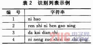 、趯(xiě)入識(shí)別列表。列表的規(guī)則是,每個(gè)識(shí)別條目對(duì)應(yīng)一個(gè)特定的編號(hào)(1個(gè)字節(jié)),編號(hào)可以相同,可以不連續(xù),但是數(shù)值要小于256(00H~FFH)。本芯片最多支持50個(gè)識(shí)別條目,每個(gè)識(shí)別條目是標(biāo)準(zhǔn)普通話(huà)的漢語(yǔ)拼音(小寫(xiě)),每2個(gè)字(漢語(yǔ)拼音)之間用一個(gè)空格間隔。本文中采取了連續(xù)不同編號(hào)的識(shí)別條目,表2是簡(jiǎn)單的示例。