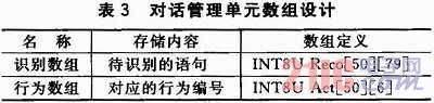 為了方便進(jìn)行對(duì)話(huà)的管理,本文中設(shè)計(jì)了一個(gè)對(duì)話(huà)管理單元,用于對(duì)等待識(shí)別的語(yǔ)句和等待執(zhí)行的命令進(jìn)行存儲(chǔ),在主控制器中通過(guò)定義二維數(shù)組來(lái)實(shí)現(xiàn)。LD3320每次識(shí)別最多可以設(shè)置50項(xiàng)候選識(shí)別句,每個(gè)識(shí)別句可以是單字、詞組或短句,長(zhǎng)度為不超過(guò)10個(gè)漢字或者79個(gè)字節(jié)的拼音串。基于上述原因,本文設(shè)計(jì)的對(duì)話(huà)管理數(shù)組如表3所列。