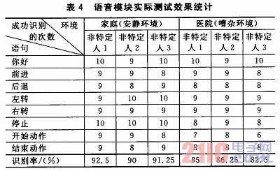 為了保證設(shè)計(jì)的語(yǔ)音識(shí)別模塊的語(yǔ)音識(shí)別率、穩(wěn)定性和響應(yīng)時(shí)間,本文對(duì)所描述的語(yǔ)音識(shí)別模塊做了相應(yīng)的測(cè)試,測(cè)試環(huán)境分別為安靜的家庭環(huán)境和嘈雜的醫(yī)院環(huán)境,共8條語(yǔ)音指令,對(duì)每條語(yǔ)音指令分別進(jìn)行10次測(cè)試,每個(gè)環(huán)境下對(duì)每個(gè)特定人的總實(shí)驗(yàn)次數(shù)為80次,記錄成功識(shí)別的次數(shù)。測(cè)試結(jié)果如表4所列。