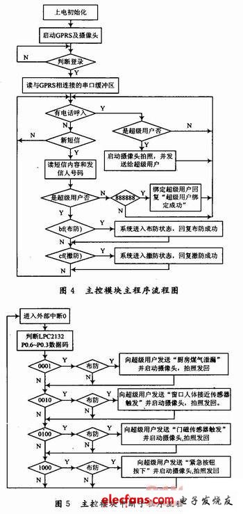 在主控模塊主程序中系統(tǒng)一直在檢測是否有來電和新短信信息,當有來電時系統(tǒng)會自動掛斷電話,然后判斷是不是超級用戶:是,啟動攝像頭拍照,并發(fā)送給超級用戶;不是,系統(tǒng)將不理睬,繼續(xù)檢測。當是短消息時,判斷是否是超級用戶:不是,判斷短信內(nèi)容是“888888 ”否,是則系統(tǒng)綁定該號碼為超級用戶,并回復“超級用戶綁定成功”;是,判斷短信內(nèi)容是否是“bf”或“cf”,是“bf”系統(tǒng)進入布防狀態(tài),并回復“布防成功”,是“cf”系統(tǒng)撤防,回復“撤防成功”。
