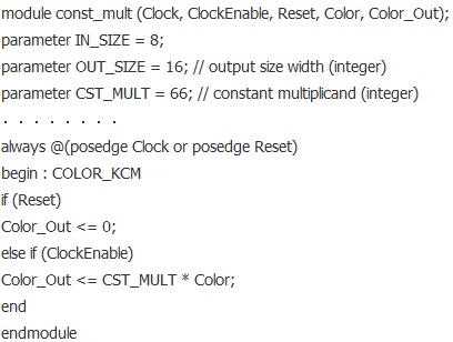 模塊csc.v中,調用const_mult模塊,通過參數傳遞改變參數IN_SIZE,OUT_SIZE,CST_MULT的值,然后實現加法運算。