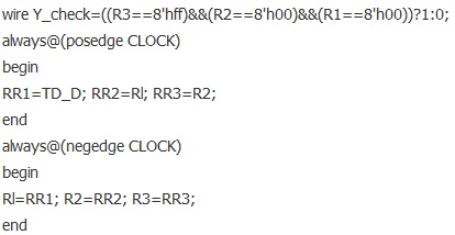 其中的wire變量Y_check就是當檢測到FF,00,00的時候就為1的標志。根據上文所述,區(qū)分SAV和EAV是根據XY來決定,區(qū)分奇偶場是根據XY來區(qū)分,所以只有隨后的信號是SAV的時候,信號分配電路才有效,所以需要描述一段邏輯來判斷,代碼如下: