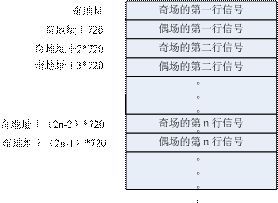 第1種:將一幀的數據存儲下來,根據奇偶場的不同(區(qū)分可以根據XY),在寫周期的時候,因為奇場的行之間有偶場的信號,所以寫數據的時候需要跳地址寫,根據行同步信號(或者SAV也可以)來區(qū)分行,換行的時候地址要加額外的720(用來存放夾雜在奇場信號中的偶場信號),直到出現偶場信號(也就是XY=1)地址切換為初始基地址加720,其余的同奇行的處理方法,具體的地址分配表參照圖4。