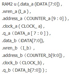 方法2 可以這樣實現:在FPGA內部使用Megacore,構造一個雙口的RAM,雙口RAM的輸入輸出信號的硬件描述語言定義如下: