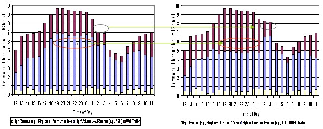 合理調(diào)配資源是指應(yīng)用智能管道技術(shù),并結(jié)合激勵(lì)型市場(chǎng)定價(jià),運(yùn)營(yíng)商能夠減少網(wǎng)絡(luò)空載時(shí)間或降低低載率,在網(wǎng)絡(luò)忙時(shí)留出更多的資源給高付費(fèi)用戶(hù)和業(yè)務(wù),從而在相同的資源下獲得更高的收益。下圖是某運(yùn)營(yíng)商引入智能管道前后的數(shù)據(jù)分布效果圖,忙時(shí)高付費(fèi)業(yè)務(wù)增加,非忙時(shí)總業(yè)務(wù)量增加(主要來(lái)自于低付費(fèi)業(yè)務(wù)),這些都為運(yùn)營(yíng)商帶來(lái)了額外的收入。實(shí)際增收效果會(huì)因智能管道策略的力度和動(dòng)態(tài)調(diào)整的效果而有不同,通常都會(huì)增加幾個(gè)百分點(diǎn)甚至更高。
