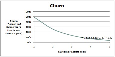 部署智能管道可以在網(wǎng)絡(luò)容量和業(yè)務(wù)保障方面產(chǎn)生積極影響。針對(duì)高端用戶(hù)提供免溢價(jià)的高價(jià)值服務(wù)/業(yè)務(wù),會(huì)提高高端用戶(hù)群體的滿(mǎn)意度。高端用戶(hù)是高額利潤(rùn)的保障,是所有運(yùn)營(yíng)商爭(zhēng)取的目標(biāo),而用戶(hù)滿(mǎn)意度是決定他們是否留在網(wǎng)絡(luò)的最重要因素。應(yīng)用智能管道后,預(yù)期年離網(wǎng)率將下降1%~2%。離網(wǎng)率的降低,將使用戶(hù)平均停留在本網(wǎng)絡(luò)的周期加長(zhǎng),從而增加收入并減少新用戶(hù)的獲取成本。這一部分的價(jià)值和意義,將大于資源合理分配和差異化業(yè)務(wù)的價(jià)值。下面的圖表顯示了離網(wǎng)率和用戶(hù)滿(mǎn)意度的關(guān)系。