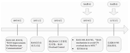 在2010年9月的RAN #49次全會(huì)上,在SA的推動(dòng)下,RAN全會(huì)決定成立一個(gè)關(guān)于MTC的新的WI,用來解決避免大量MTC設(shè)備接入導(dǎo)致的核心網(wǎng)過載問題。2011年3月份,RAN2完成了此WI并在RAN全會(huì)上通過。圖4所示的是3GPP MTC R10標(biāo)準(zhǔn)化項(xiàng)目進(jìn)程情況。