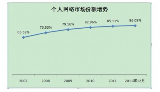 相反,固話的市場份額卻在持續(xù)下降,從2007年的19.81%到2011年12月的3.53%。手機時尚、輕便、性價比高,廣受歡迎,所以增長速度越來越快,F(xiàn)在手機已經(jīng)是尋常百姓的尋常物品了。