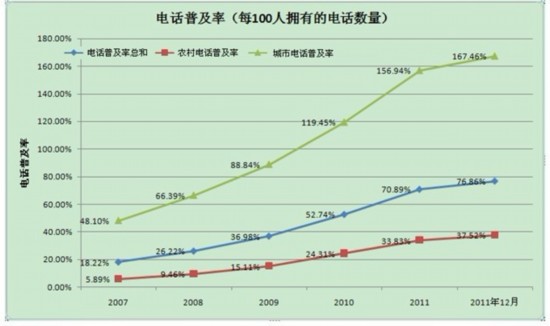 城市電話普及率從2007年3月的48.10%,增長到2011年3月的156.94%,到2011年12月底達到167.46%。