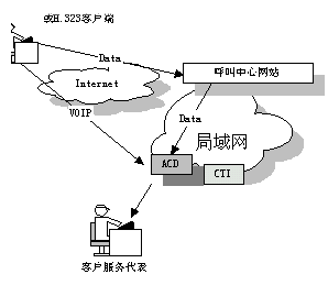 國(guó)際上一些先進(jìn)的 呼叫中心產(chǎn)品供應(yīng)商現(xiàn)在已經(jīng)把 Web 技術(shù)引入到他們的產(chǎn)品中了。通過(guò)屏幕上的一個(gè)按鈕可以利用 Internet 電話把客戶和呼叫中心連接起來(lái)。客戶使用一個(gè)很普通的帶有麥克風(fēng)﹑聲卡以及傳輸速率不小于 28.8 kbps 的Modem 的多媒體 PC 機(jī),并配有 Web 瀏覽器以及與 H.323兼容的應(yīng)用軟件就可以利用把他們連接到 Web 站點(diǎn)的那條電話線與呼叫中心的座席員交談。其簡(jiǎn)單示意圖如下: