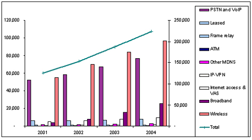 IDC亞太地區(qū)通信研究機構(gòu)的負(fù)責(zé)人Sandra Ng表示,在傳統(tǒng)數(shù)據(jù)業(yè)務(wù)市場包括租用電路、幀中繼、DDN、ATM、X.25以及ISDN,其中租用電路業(yè)務(wù)的收入依然占據(jù)了主導(dǎo)地位,隨后是DDN業(yè)務(wù)和幀中繼。2002年這一傳統(tǒng)數(shù)據(jù)業(yè)務(wù)市場的規(guī)模有望達到100億美元,增長百分之5。
