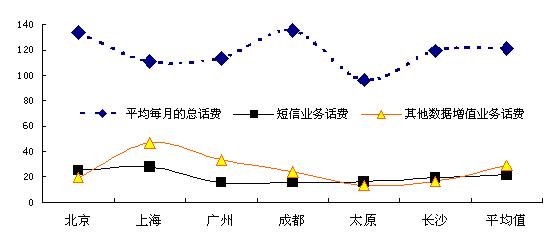 調(diào)查數(shù)據(jù)顯示,在所訪6個(gè)城市的手機(jī)用戶(hù)中,過(guò)去三個(gè)月平均每個(gè)月的話費(fèi)總額平均為121.3元(以北京和成都的用戶(hù)平均總話費(fèi)較高),其中短信話費(fèi)平均每月為14.0元,而其它數(shù)據(jù)增值業(yè)務(wù)話費(fèi)平均話費(fèi)為4.8元。