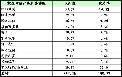 數(shù)據(jù)增值業(yè)務(wù)品牌認(rèn)知度較高的是移動(dòng)夢(mèng)網(wǎng)、聯(lián)通無(wú)限等,而使用率很低