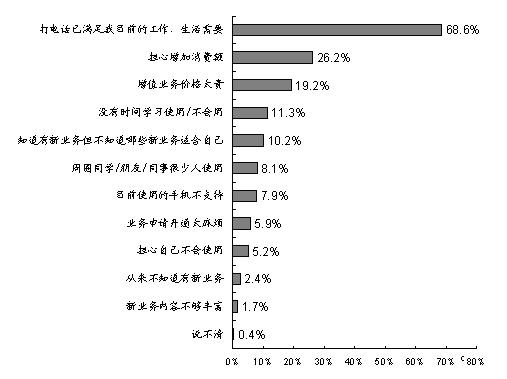 調(diào)查發(fā)現(xiàn),目前制約手機(jī)用戶(hù)使用更多數(shù)據(jù)增值業(yè)務(wù)的原因主要是:“打電話已經(jīng)滿(mǎn)足目前的工作/生活需要”(占68.6%)、“擔(dān)心增加消費(fèi)額”(占26.2%)、“增值業(yè)務(wù)價(jià)格太貴” (占19.2%)、“沒(méi)有時(shí)間學(xué)習(xí)使用/不會(huì)用”(占11.3%)、“知道有新業(yè)務(wù)但不知道哪些新業(yè)務(wù)適合自己”(占10.2%)等。