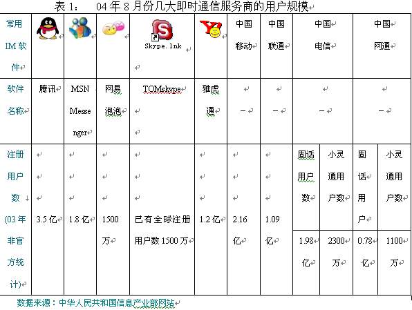 11月16日,TOM在線和歐洲行業(yè)巨頭Skype在京聯(lián)手推出聊天工具TOM-Skype,此業(yè)務(wù)的出現(xiàn),立即在即時(shí)通信市場(chǎng)上掀起了軒然大波。其清晰的話音質(zhì)量,簡(jiǎn)潔方便的操作界面,擁有來自165個(gè)國家1500多萬的全球用戶,在極短的時(shí)間內(nèi)就吸引到了大量的中國用戶,更讓基礎(chǔ)運(yùn)營商感到不安的是skype強(qiáng)大的語音聊天功能將可能大大改變傳統(tǒng)電信的使用習(xí)慣;而與此同時(shí),現(xiàn)有的QQ,POPO等國內(nèi)即時(shí)通信工具也早已開展了語音聊天功能,只是苦于目前話音質(zhì)量不盡理想而已。面對(duì)眾多虛擬運(yùn)營商現(xiàn)實(shí)和潛在威脅,幾大基礎(chǔ)運(yùn)營商選擇先下手為強(qiáng),進(jìn)入“即時(shí)通信”市場(chǎng)的戰(zhàn)略也就不足為怪了。