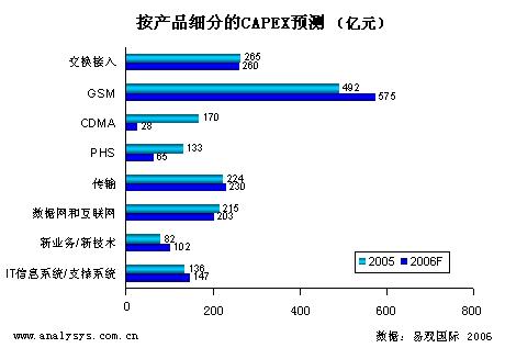 易觀國際預測2006年全國電信運營商的資本總開支為2053億(不包括 3G 資本開支),比2005年下降1%?偟目磥,運營商在