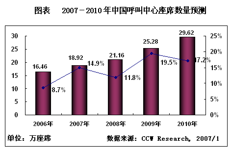計世資訊(CCW Research)的研究成果《2006-2007年中國呼叫中心市場研究報告》預計,2007-2010年中國呼叫中心的產(chǎn)業(yè)投入規(guī)模平均年度復合增長率將超過20%,預計2007年中國呼叫中心投入規(guī)模將達到337.19億元,同比增長24.8%。由于2007、2009兩個年度中國呼叫中心將開始更換新的系統(tǒng)平臺,并開拓遠程座席市場,因此2007年的呼叫中心座席規(guī)模增長率高于2006年,2009年的呼叫中心座席規(guī)模增長率高于2008年。預計2007年中國呼叫中心座席數(shù)量將達到18.92萬個,同比增長14.9%;而2006年呼叫中心座席數(shù)量的同比增長率僅僅是8.7%,可見2007年的增長率比2006年的高出6.2個百分點。計世資訊(CCW Research)研究認為,2007年成為中國呼叫中心產(chǎn)業(yè)發(fā)展的轉(zhuǎn)折點,2007年中國開始進入第二波呼叫中心建設高潮期。