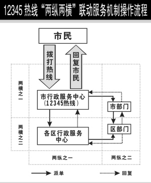 為了保證熱線順利開通提供優(yōu)質(zhì)服務(wù),有關(guān)方面還建立了“兩縱兩橫”聯(lián)動服務(wù)機制。“兩縱”即市行政服務(wù)中心與各區(qū)行政服務(wù)中心之間的縱向聯(lián)系,市級熱線成員單位與區(qū)級熱線成員單位之間的縱向聯(lián)系;“兩橫”即市行政服務(wù)中心與市級熱線成員單位的橫向聯(lián)系,各區(qū)行政服務(wù)中心與區(qū)級熱線成員單位之間的橫向聯(lián)系。