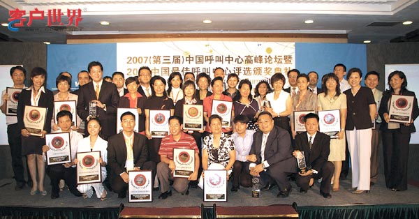 2007年9月18日,北京。[客戶世界消息]2007(第三屆)中國(guó)呼叫中心高峰論壇暨2007年中國(guó)最佳呼叫中心評(píng)選頒獎(jiǎng)典禮今天在北京舉行;本屆會(huì)議由中國(guó)電子商會(huì)呼叫中心與客戶關(guān)系管理專業(yè)委員會(huì)(CNCCA)主辦,客戶世界機(jī)構(gòu)(CCMWorld