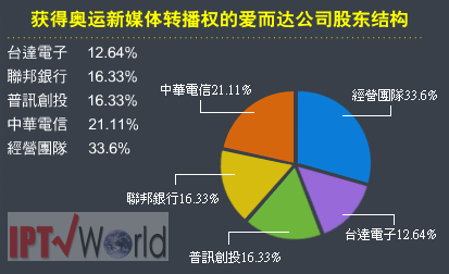據(jù)IPTVWorld了解,2008年第29屆北京奧運(yùn)比賽轉(zhuǎn)播權(quán)臺(tái)灣區(qū)網(wǎng)絡(luò)與手機(jī)平臺(tái)轉(zhuǎn)播權(quán)。國際奧委會(huì) (IOC)除了證實(shí)這項(xiàng)消息,也表示,經(jīng)過度。另外,鑒于愛爾達(dá)在美國職棒等運(yùn)動(dòng)賽事和韓劇等數(shù)字內(nèi)容版權(quán)經(jīng)營與后制服務(wù)擁有豐富的實(shí)務(wù)經(jīng)驗(yàn),中華電在今年4月進(jìn)一步以溢價(jià)參與愛爾達(dá)增資,取得21%的股權(quán),成為愛爾達(dá)除了經(jīng)營團(tuán)隊(duì)外最大的股東。