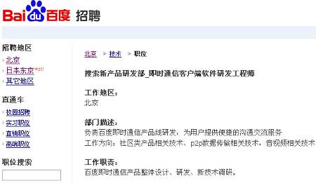 百度有意推IM產(chǎn)品的傳聞由來已久,不過該傳聞一直未得到官方證實。但在其官網(wǎng)最新公布的招聘頁面中,百度已向外界羅列出即時通信客戶端軟件研發(fā)工程師(搜索新產(chǎn)品研發(fā)部)、即時通信軟件產(chǎn)品經(jīng)理(客戶端軟件業(yè)務部)等職位,上述工作地點均在北京,可見百度的IM戰(zhàn)略布局已具雛形。