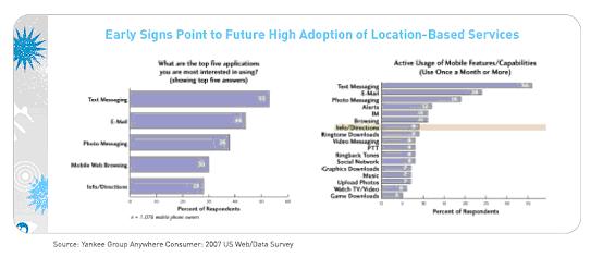當美國聯(lián)邦通信委員會(FCC)在2001年強制要求實施911增強功能時,移動行業(yè)就開始通過將導(dǎo)航服務(wù)引入大眾市場來獲利。7年后,絕大多數(shù)手機都集成了GPS功能,幾大主要的移動運營商也都計劃在年內(nèi)推出至少一項基于GPS 的導(dǎo)航應(yīng)用。揚基集團認為,2008年正在成為美位置服務(wù)的轉(zhuǎn)折點。