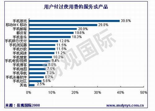 據(jù)易觀國際《中國手機(jī)應(yīng)用市場用戶調(diào)研報告2008》研究發(fā)現(xiàn),用戶付過使用費的手機(jī)應(yīng)用服務(wù)及產(chǎn)品中,手機(jī)游戲、移動IM和手機(jī)郵箱的比例較高。其中39.6%的手機(jī)應(yīng)用用戶付費玩過手機(jī)游戲,29.8%的用戶曾經(jīng)為移動IM付費,而手機(jī)郵箱的付費用戶將達(dá)20%。其他手機(jī)應(yīng)用產(chǎn)品或服務(wù)中,付費用戶的比例相當(dāng),均在10%左右,但是有近20%的用戶沒有用過任何的付費服務(wù)或產(chǎn)品。