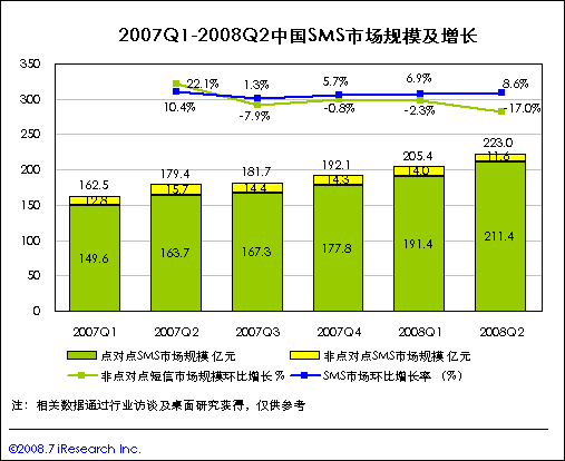 08Q3中國(guó)短信市場(chǎng)規(guī)模將繼續(xù)保持增長(zhǎng),非點(diǎn)對(duì)點(diǎn)業(yè)務(wù)下滑放緩