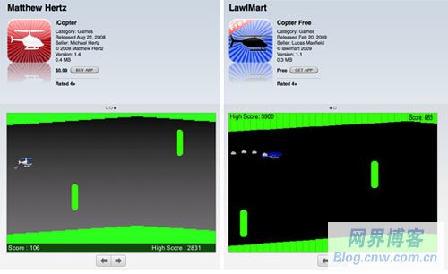 某些情況下,抄襲的應(yīng)用是被抄襲的付費應(yīng)用的免費版。比如Copter Free的開發(fā)者在他的應(yīng)用描述里寫道:“如果你喜歡