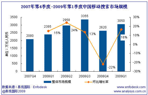 2009年第1季中國移動(dòng)搜索市場(chǎng)收入達(dá)3050萬,環(huán)比增長(zhǎng)16%