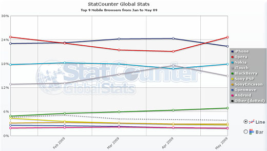根據(jù)StatCounter的統(tǒng)計(jì)數(shù)字,Opera的移動(dòng)瀏覽器在5月幾乎完全從2009年一到四月每月穩(wěn)定下降三個(gè)百分比的低潮中恢復(fù)過(guò)來(lái)了。StatCounter在1月特別點(diǎn)出 Opera在移動(dòng)瀏覽市場(chǎng)的占有24.69%,比這個(gè)月高出0.05%。不論這個(gè)月的使用數(shù)字到底為何,至少數(shù)字回升了,這無(wú)疑是Opera值得驕傲的事。