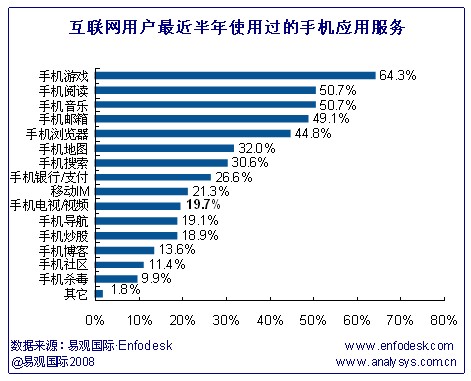 互聯(lián)網(wǎng)用戶近半年使用過的手機(jī)應(yīng)用按比例排列依次是手機(jī)游戲、手機(jī)閱讀、手機(jī)音樂、手機(jī)郵箱以及手機(jī)瀏覽器。其中手機(jī)游戲的使用率達(dá)64.3%。手機(jī)閱讀、手機(jī)音樂及手機(jī)郵箱的使用率均在一半左右,而手機(jī)瀏覽器的使用率達(dá)44.8%。具體如下圖: