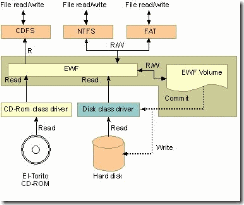 EWF能夠使操作系統(tǒng)可以從只讀媒體(如 CD ROM、寫保護(hù)硬盤或閃存)中啟動。所有對受到 EWF保護(hù)的卷進(jìn)行的寫入都被重定向到覆蓋。這些寫入被緩存在覆蓋中并且作為卷的一部分提供。這會產(chǎn)生該卷可寫的表象。覆蓋可能存在于磁盤或隨機(jī)訪問內(nèi)存 (RAM) 中。如果需要,可以將覆蓋中存儲的數(shù)據(jù)提交給受保護(hù)的卷。