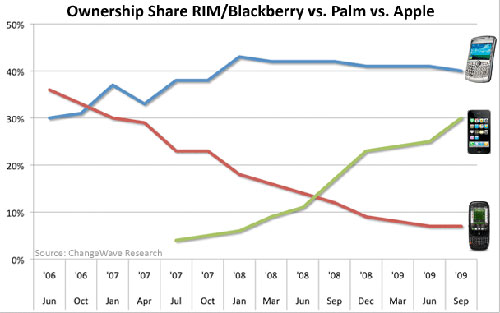 ChangeWave Research今年9月對4255名美國用戶進(jìn)行的調(diào)查顯示,其中39%擁有智能手機(jī),高于7月的37%,較去年同期幾乎翻番。雖然RIM黑莓仍然占據(jù)榜首,但是其市場份額增長已經(jīng)開始停滯,目前約為40%,與去年同期基本持平,而iPhone則保持了快速上升勢頭,由去年同期的不足20%,增長到現(xiàn)在的30%。