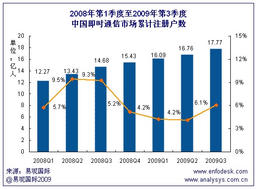根據(jù)易觀國際Enfodesk產(chǎn)業(yè)數(shù)據(jù)庫即將發(fā)布的《2009年第3季度中國即時(shí)通信市場季度監(jiān)測》數(shù)據(jù)顯示,2009年第3季度中國即時(shí)通訊市場累計(jì)注冊賬戶數(shù)達(dá)到17.77億,環(huán)比增長6.1%,同比增長21%。