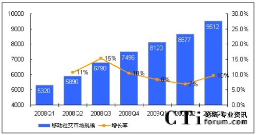 CTI論壇(ctiforum)12月8日消息(記者 楊悅):馳昂咨詢(Sinotes)發(fā)布的《2009年中國移動互聯網業(yè)務市場監(jiān)測-第三季度》報告數據顯示,2009年Q3中國移動社交業(yè)務市場規(guī)模才超過9000萬元,達9512萬元,直逼億元大關。與2009年Q2相比,增長率達10%。預計其年增長率將超過30%。