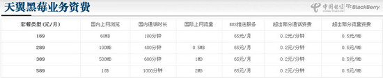 目前電信推出的黑莓手機(jī)套餐分為四類,一類為天翼黑莓簡(jiǎn)裝版,價(jià)格為每月189元,包括60MB國內(nèi)上網(wǎng)流量,100分鐘國內(nèi)語音通話時(shí)長(zhǎng);第二類是天翼黑莓標(biāo)準(zhǔn)版套餐,價(jià)格為289元,包括100MB國內(nèi)上網(wǎng)流量,0.5MB國際上網(wǎng)流量,400分鐘國內(nèi)語音通話時(shí)長(zhǎng);第三類和第四類為天翼尊享版套餐包括389元和589元兩種資費(fèi),前者包括500MB國內(nèi)上網(wǎng)流量,1MB國際上網(wǎng)流量,600分鐘國內(nèi)語音通話時(shí)長(zhǎng);后者包括1GB國內(nèi)上網(wǎng)流量,2MB國際上網(wǎng)流量,1000分鐘國內(nèi)語音通話時(shí)長(zhǎng)。