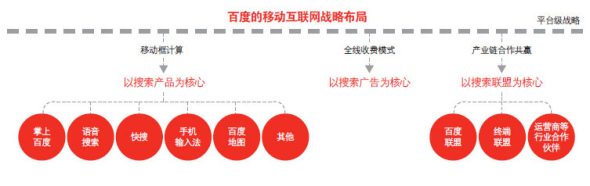 百度無線的戰(zhàn)略仍將以搜索作為核心!鞍俣仍跓o線方面的核心發(fā)展規(guī)劃就三條:第一條,以搜索產(chǎn)品為核心布局移動框計算。第二條,以搜索廣告位核心,探索全線收費模式。第三條,以搜索聯(lián)盟為核心,推動產(chǎn)業(yè)鏈合作共贏!边@是百度的官方說法。