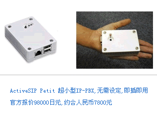 日本C-Borne公司發(fā)布了世界上最小的IP-PBX產(chǎn)品ActiveSIP Petit,采用Asterisk(米國Digium,Inc.開発),具備昂貴的專有PBX所有功能。這款比手掌還要小的IP-PBX設(shè)備適合小型辦公室和商店使用,可以通過網(wǎng)絡(luò)更新配置和設(shè)置,無需專業(yè)IP人士也可以搭建IP-PBX環(huán)境。利用楽天株式會(huì)社的Fusion通訊服務(wù),將大大降低成本電話費(fèi)和電信設(shè)備投資。